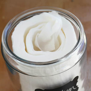 Om te gebruiken, trek je de doekjes vanuit het midden van de rol omhoog. Let erop dat je na elk gebruik de pot weer goed sluit.
