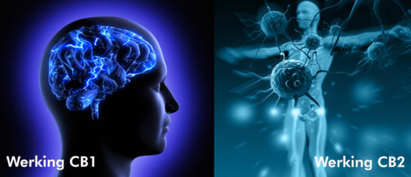Deze twee componenten zijn verbonden aan twee verschillende structuren: de CB1- en CB2-receptoren. CB1-receptor leiden tot gevoelens van euforie. Deze receptoren worden voornamelijk aangetroffen in de hersenen en het centrale zenuwstelsel en zijn dus gekoppeld aan plezier- en beloningssyteem. CB2-receptoren worden gevonden in de rest van het lichaam, zoals in de spieren, huid en vitale organen. Ze worden voornamelijk aangetroffen op het oppervlak van witte bloedcellen. Ze beïnvloeden je immuunsysteem.